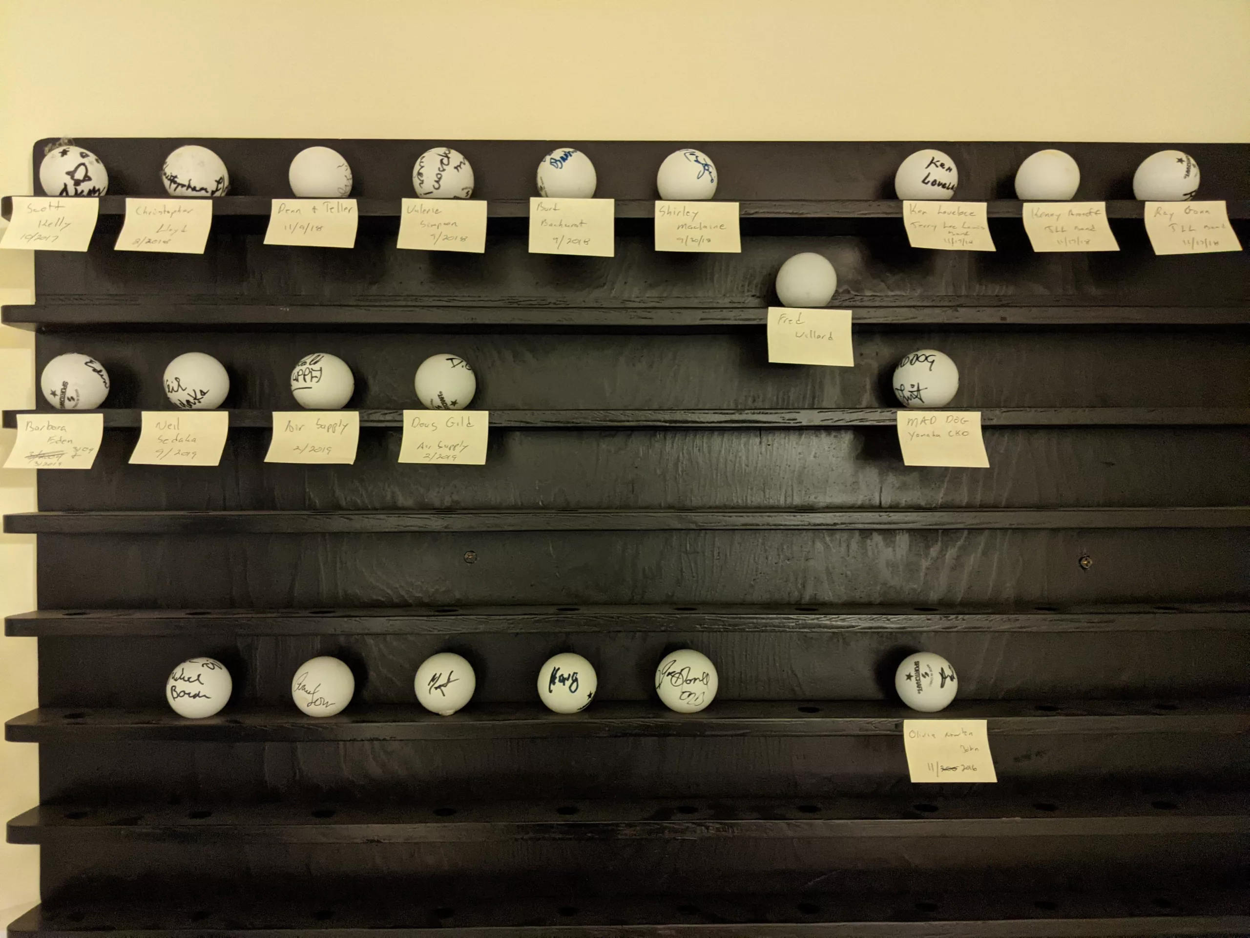 I always enjoy working with Lance Burton. It was his sixth time visiting the Cerritos Canter for the Performing Arts. Last time he came I asked him if he had signed our balls .(Ping Pong Balls that is!) He couldn’t remember, so we went in the office to check. He did, many years ago– two balls in fact. But he really wanted to see the collection anyways. He said he had heard about it but had never seen it. So I took him to look at the collection. The technical staff only has performers WE like sign the ping pong balls. All performers sign a tile for the lobby.