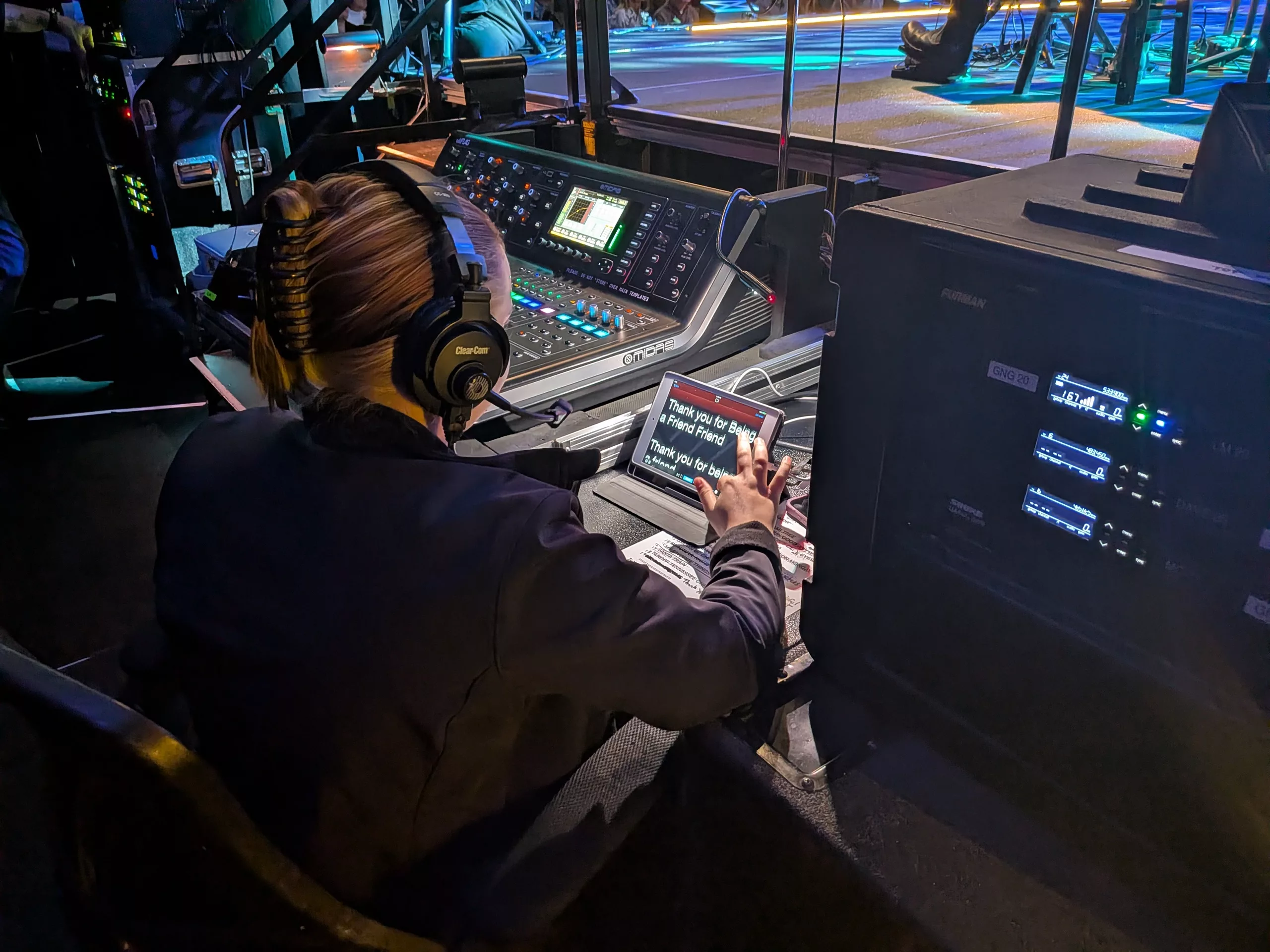 She excels at nearly every task we give her—and then some. Ducky had even started teaching her the art of mixing monitors until our Executive Director put the kibosh on that effort. Which brings me to the “troubles” section of this post.