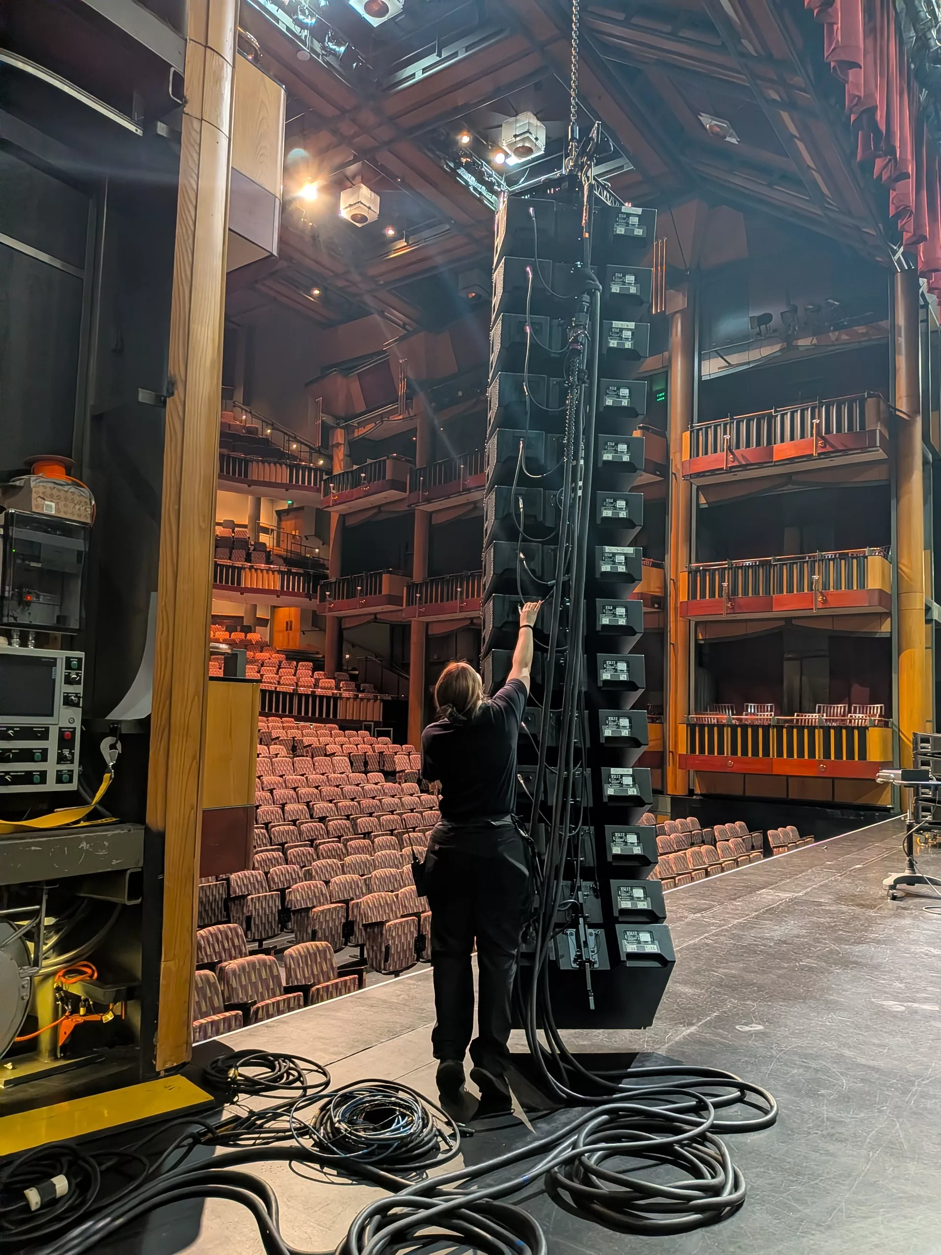 Sarah inspecting the PA line array.